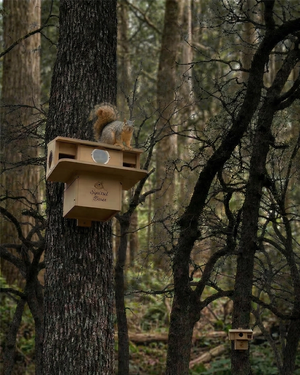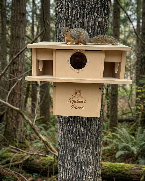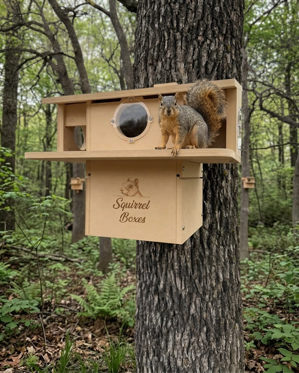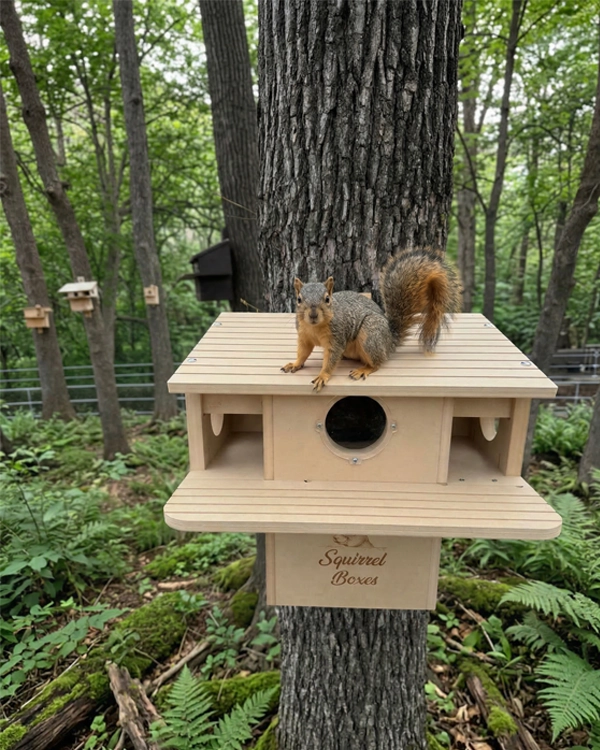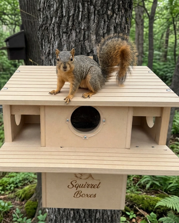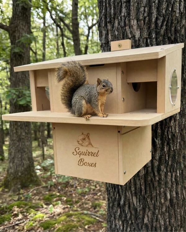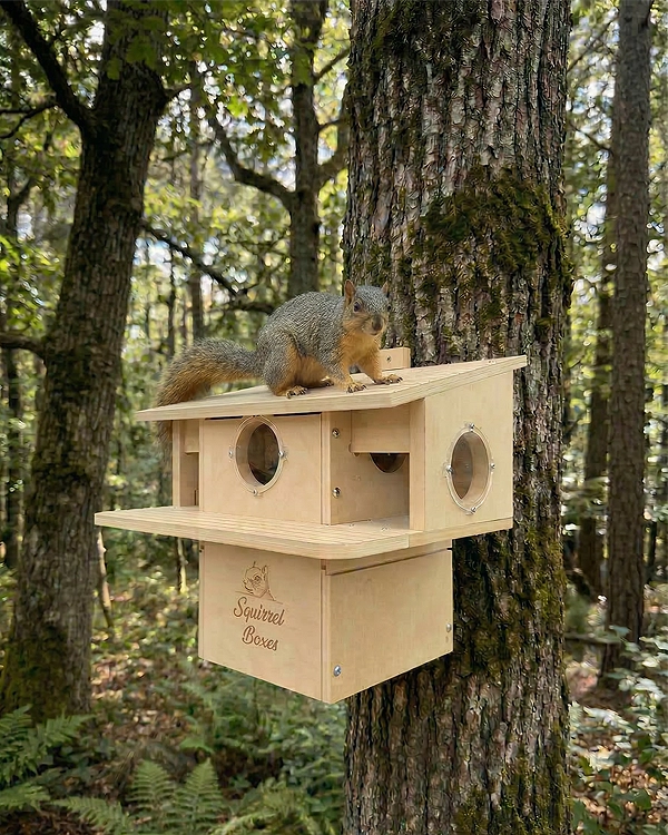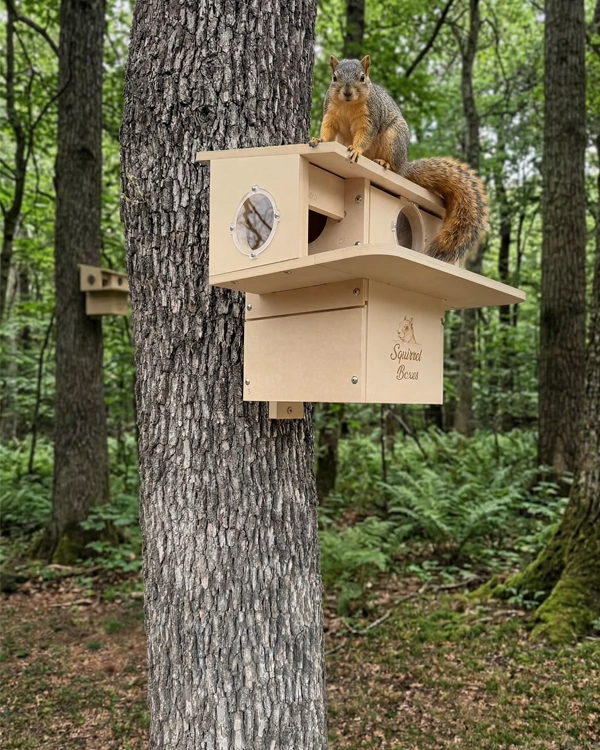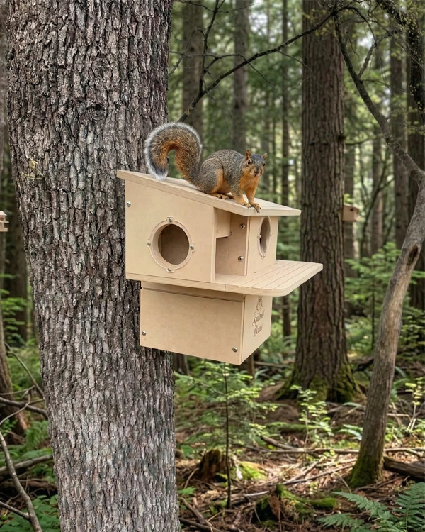 Porchside Paradise is a thoughtfully designed dual-entrance squirrel nesting box built to provide a safe, elevated outdoor shelter for squirrels. Constructed from durable composite materials, this squirrel house is made for long-term outdoor use while maintaining its structure in changing weather conditions. Featuring two front entrances, squirrels have easy access along with quick exit routes, supporting natural movement and added security. The integrated porch perch offers a comfortable space for squirrels to lounge, observe their surroundings, and interact with their environment. The design also includes multiple viewing openings that create a bright, open interior while maintaining protection. This outdoor squirrel habitat is ideal for nesting, resting, and raising young, making it a reliable shelter for wildlife enthusiasts looking to support local squirrel populations.