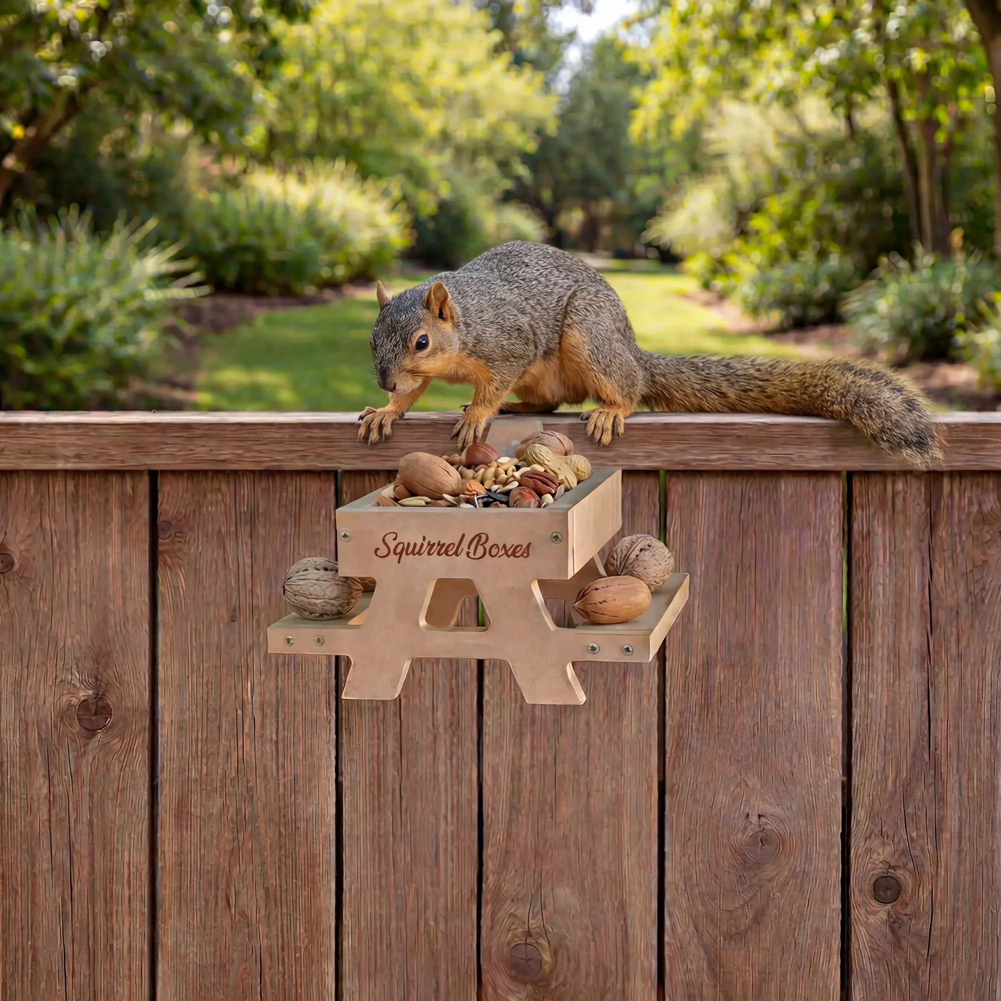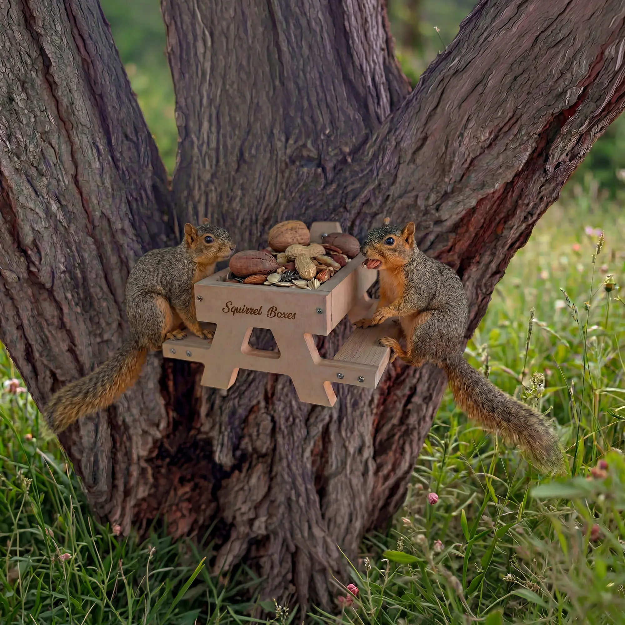 • Classic squirrel picnic table feeder design