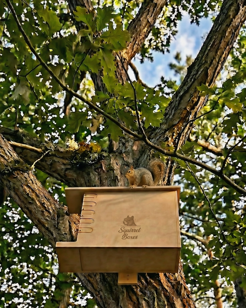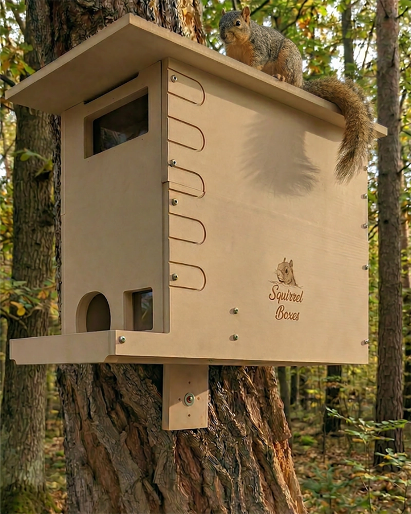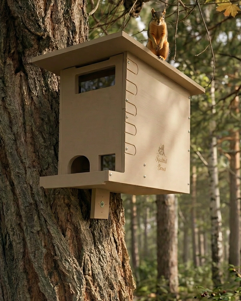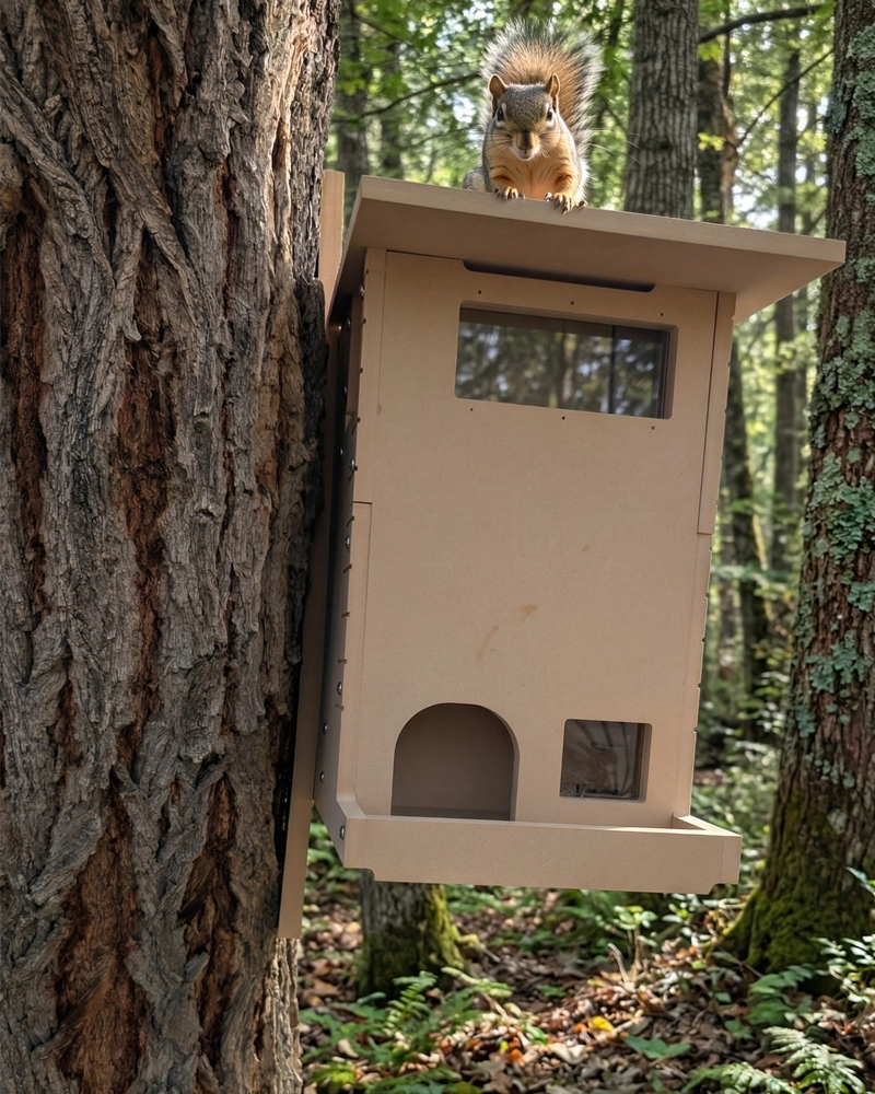 The Sentinel Watchtower was designed to give squirrels a safe, elevated home while allowing you a rare look into their world. Built with both protection and observation in mind, this design creates a secure nesting space while remaining fully compatible with interior cameras for those who want to watch the daily lives unfolding inside.